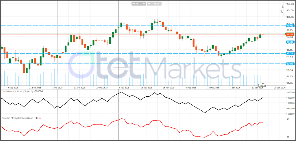 المستويات الرئيسية: المقاومة عند 99.80–100.00، ثم 100.40–100.60، مع كون 101.00–101.50 ذات صلة فقط إذا تطور نطاق صاعد جديد. الدعم يقع عند 99.15، ثم 98.53، يليه 97.73 وأرضية النطاق قرب 96.92.