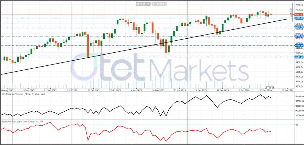 دعم خط الاتجاه يتقارب الآن مع السعر في المستويات العليا لـ 6800 / المنخفضة لـ 6900، مما يخلق منطقة التقاء دعم ملحوظة حول 6908 وخط الاتجاه الصاعد. مع مقاومة مسطحة نسبياً في منطقة 6945–7000 ودعم صاعد، يبدو الرسم البياني أشبه بـ “مثلث صاعد” أو انضغاط سعري: الثيران يدافعون عن قيعان أعلى تدريجياً بينما يظهر البائعون بشكل متكرر عند نفس السقف. غالباً ما تُحل هذه الإعدادات عبر الاختراق، لكن التأكيد يعتمد على الإغلاق اليومي والقبول السعري، وليس مجرد اختراقات لحظية عابرة.