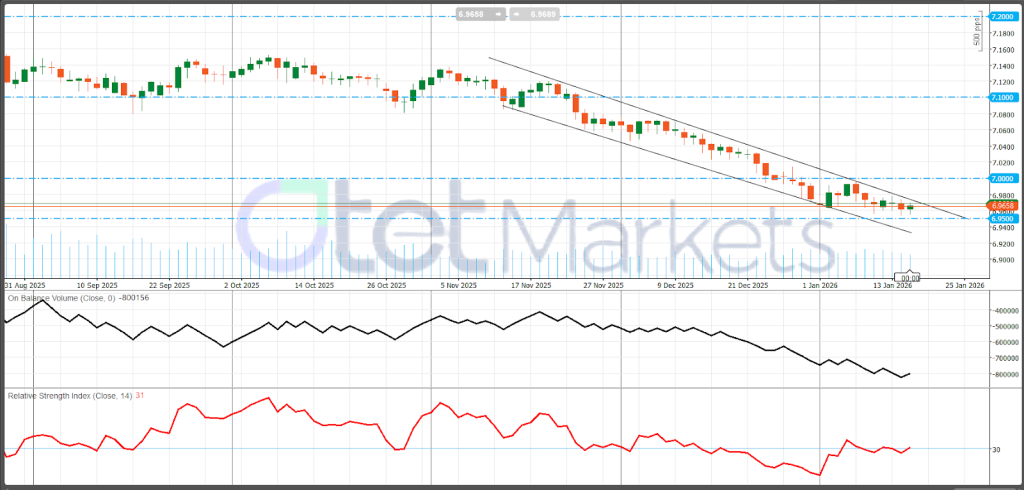 المستويات الرئيسية: المحور الفوري هو 6.965–6.97. استعادته تدعم ارتداداً تصحيحياً. المقاومة تتركز عند 7.000 (محور نفسي)، ثم 7.100، و7.200. على الجانب السفلي، 6.950 هو أقرب “خط في الرمل”، كسره يفتح المجال نحو 6.930–6.920.