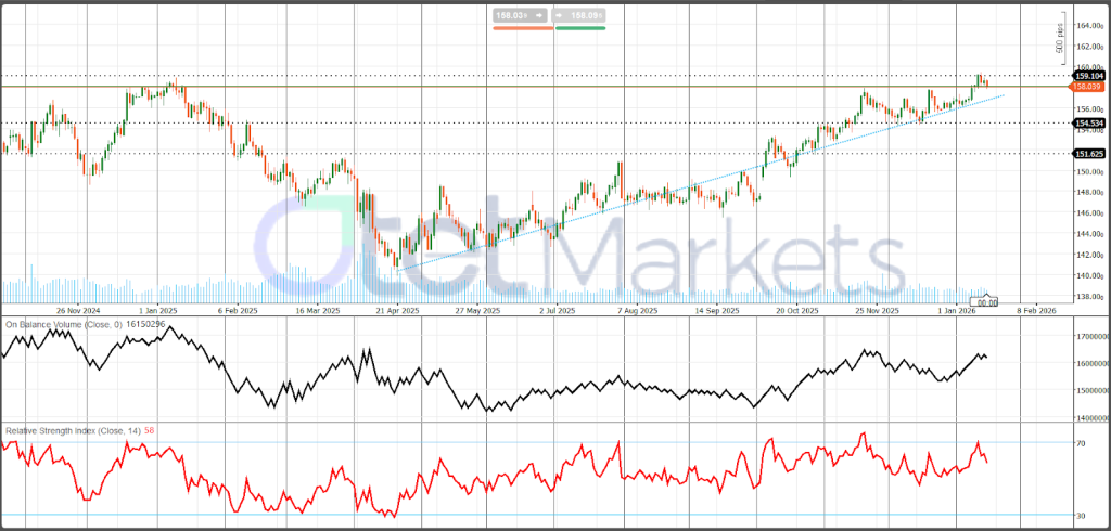فنيًا، لا يزال الاتجاه الأساسي لزوج الدولار/الين (USD/JPY) صاعدًا منذ قاع أبريل 2025، إلا أن الحركة تحولت إلى تماسك ضمن نطاق مرتفع منذ أكتوبر، مع تداول الزوج في منتصف إلى أعلى مستويات 150 تحت مقاومة قريبة من 160. ويشير مؤشر القوة النسبية (RSI) قرب 58 إلى زخم بنّاء. وتتمثل المقاومة الرئيسية عند 159.10 ثم 160.00، حيث يتطلب الاختراق تأكيدًا بالإغلاق أعلى هذا المستوى، بينما يقع الدعم عند 158.00 ثم منطقة خط الاتجاه الصاعد قرب 157–158. ويظل الإعداد العام داعمًا لاستمرار الاتجاه، لكن التأكيد يتوقف على كسر واضح ونظيف لمستوى 160.