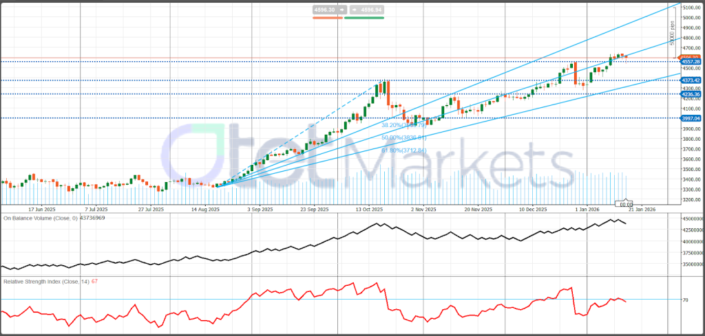 الاتجاه الأساسي لا يزال صاعداً، مع حفاظ المؤشر على ثباته فوق خط الاتجاه الصاعد الذي قاد الارتفاع منذ أواخر أغسطس. ومع ذلك، تعكس حركة السعر على المدى القريب تماسكاً (Consolidation) قرب القمم: منذ أواخر ديسمبر، تحرك السوق بشكل جانبي إلى أعلى قليلاً بدلاً من الامتداد في اتجاه واضح. هذا إعداد كلاسيكي لـ “اتجاه + توقف مؤقت” لا يزال الثيران يسيطرون على الهيكل العام، لكن السعر يضغط للحصول على تأكيد عند المقاومة العلوية.
