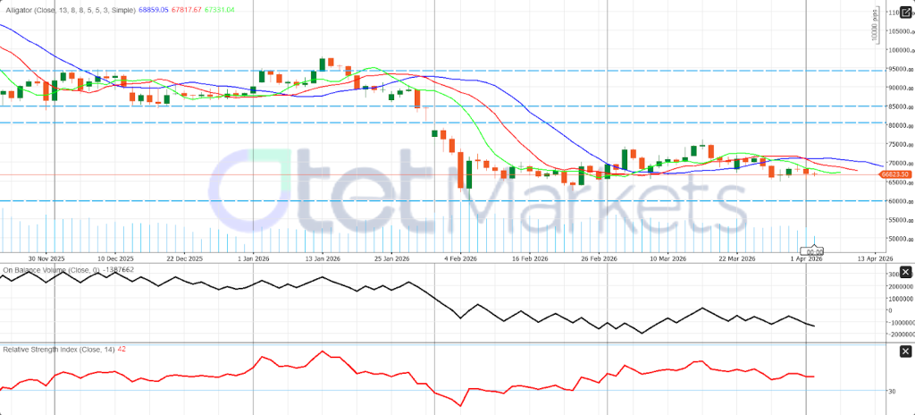 من الناحية الفنية، لا يزال زوج BTC/USD هشًا على الإطار اليومي. فمنذ كسره لمنطقة 90–95 ألف دولار في بداية فبراير، دخل البيتكوين في نطاق تداول أدنى، ويتداول حاليًا قرب 66.8 ألف دولار، دون جميع خطوط مؤشر Alligator، ما يشير إلى ضعف الاتجاه وعدم تأكيد التعافي. الحركة السعرية بين 66 ألف و70 ألف تبدو كحالة تماسك بعد هبوط، وليست بداية موجة صعود جديدة.
