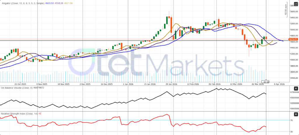 تقع منطقة المقاومة الرئيسية بين 4675 و4700، واختراقها قد يفتح الطريق نحو مستويات 4800 ثم 5000. أما من جهة الدعم، فتظهر أول منطقة عند 4620–4600، تليها 4555، ثم منطقة 4400–4320.