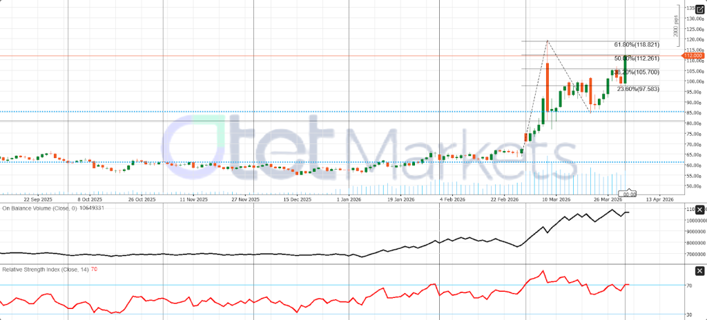 السيناريو الأساسي لهذا الأسبوع هو ارتفاع أسعار النفط وتقلبها، مدفوعةً بالأخبار، مع ترجيح حدوث ارتفاعات مفاجئة بدلًا من انخفاض حاد في الأسعار ما لم يُحرز تقدم ملموس في مضيق هرمز. وتتمثل العوامل الرئيسية الثلاثة في: إشارة أوبك+ يوم الأحد، وتحديث توقعات إدارة معلومات الطاقة الأمريكية يوم الثلاثاء، وما إذا كانت ظروف الشحن في المضيق ستتحسن. ومن الناحية الفنية، لا يزال خام غرب تكساس الوسيط يبدو قويًا. لا يزال الاتجاه العام صعوديًا فوق مستوى 105-106، مع اختبار السعر لمنطقة فيبوناتشي 112.26. قد يؤدي تجاوز هذا المستوى إلى إعادة فتح الطريق نحو 118.82 و120، بينما لن يبدأ ضعف الاتجاه الصعودي إلا في حال كسر مستوى الدعم. لا تزال مؤشرات الزخم، بما في ذلك مؤشر القوة النسبية (RSI) القريب من 70 ومؤشر حجم التداول (OBV) القوي، تدعم الاتجاه الصعودي الأساسي، مع أنها تحذر أيضًا من استمرار ارتفاع مستوى التقلبات.