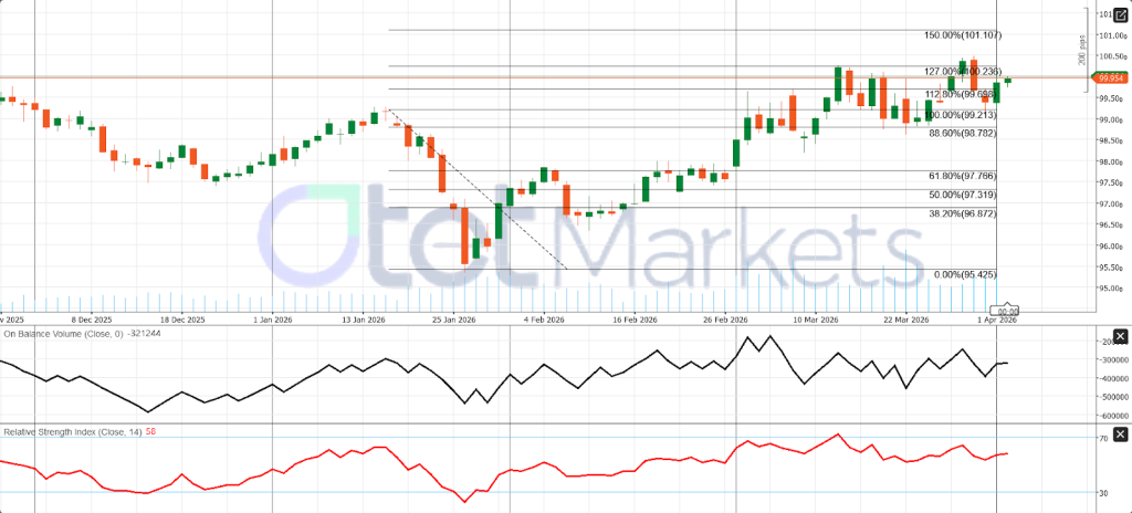 من الناحية الفنية، لا يزال أداء الدولار اليومي يميل صعودًا بشكل طفيف. فقد سجل قممًا وقيعانًا أعلى منذ أدنى مستوى له في أواخر يناير، ويختبر السعر حاليًا منطقة المقاومة المهمة بين 99.95 و100.24. وقد يؤدي اختراق هذه المنطقة إلى فتح الطريق نحو 101.10، بينما تقع مستويات الدعم حول 99.70 و99.21 و98.78. ويشير مؤشر القوة النسبية (RSI) القريب من 58 إلى زخم إيجابي دون الإشارة إلى حالة تشبع شرائي، كما تحسن مؤشر حجم التداول (OBV)، وإن لم يشهد اختراقًا قويًا حتى الآن.