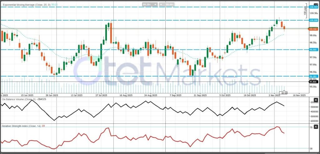 - مستويات الدعم: 99.0-99.2 (بالقرب من المتوسط المتحرك الأسي)، تليها 98.00 ومنطقة 96.00-96.20 لا يزال مؤشر حجم التداول المتوازن (OBV) داعمًا بشكل عام ولكنه بدأ في “التسطح”، مما يشير إلى انخفاض ضغط الشراء بعد الارتفاع القوي. وفي الوقت نفسه، يقع “مؤشر القوة النسبية” (RSI (14)) حول 59، مبردًا من “منطقة ذروة الشراء” (overbought) ولكنه لا يزال متسقًا مع انحياز صعودي صحي. طالما بقيت الأسعار فوق نطاق الدعم 98-99، تظل النظرة متوسطة الأجل “إيجابية” (constructive). على المدى القصير، فإن الارتداد من 99 تقريبًا نحو 100 سيعزز الاتجاه الصاعد، في حين أن كسرًا حاسمًا دون 98 قد يؤدي إلى تراجع أعمق نحو منتصف التسعينات.