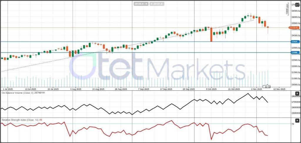 لا يزال مؤشر “ناسداك” في “اتجاه صاعد متوسط الأجل” بدأ في أوائل يوليو، حيث ارتفع من حوالي 21,000 نحو نطاق 26,000-26,300 على طول “خط اتجاه صاعد” ثابت. ومع ذلك، منذ أوائل نوفمبر، انزلق المؤشر إلى ما دون خط الاتجاه هذا، مما يشير إلى تحول محتمل من الزخم الصعودي إلى الهبوطي قصير الأجل. تُظهر الشموع الأخيرة “تماسكًا” (consolidation) أسفل قمم 26,300 مباشرة، تلاها انخفاضان قويان سحبا الأسعار مرة أخرى نحو منطقة 25,000-25,200 – والتي تعمل الآن “كدعم فوري”. يُرى دعم إضافي عند 23,970 و 23,080. تُظهر أحدث شمعة “فتيلة سفلية”، مما يلمح إلى اهتمام بالشراء عند الانخفاضات، لكن الإغلاق الضعيف يشير إلى أن السوق في “مرحلة تصحيحية” بدلاً من التحضير لاختراق. تقع “المقاومة” الرئيسية بالقرب من 26,000، مع “دعم” عند 25,000 و 23,970 و 23,080. النغمة على المدى القريب تصحيحية، لكن الحفاظ على مستوى أعلى من 25,000 يُبقي الهيكل الأوسع سليمًا.