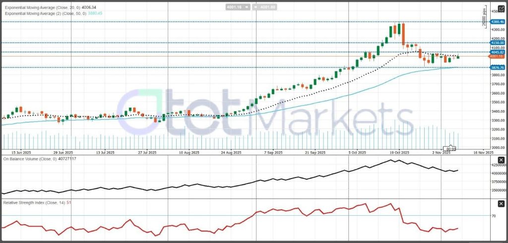 لا يزال الذهب في “اتجاه صاعد متوسط الأجل” ثابت، “يتماسك” بالقرب من 4,000 دولار بعد ارتفاع قوي من 3,200 دولار إلى ذروة أكتوبر عند 4,380 دولار. يشير “مؤشر القوة النسبية” (RSI (51)) و “تسطح مؤشر حجم التداول المتوازن” (OBV) إلى “تبريد الزخم” ولكن لا يوجد ضغط بيع. تستقر الأسعار أسفل “المتوسط المتحرك الأسي لـ 20 يومًا” (4,006 دولار) وفوق “المتوسط المتحرك الأسي لـ 50 يومًا” (3,880 دولار)، مما يشير إلى توقف صحي ضمن هيكل صعودي. تقع “المقاومة” (Resistance) عند 4,045-4,050 دولار و 4,150 دولار، مع احتمال أن يعيد الاختراق اختبار أعلى مستوى قياسي. يُرى “الدعم” (Support) عند 3,875-3,900 دولار، ثم 3,750-3,800 دولار. بشكل عام، يبدو أن السوق يتماسك ضمن اتجاه صاعد مستمر ومدعوم جيدًا.