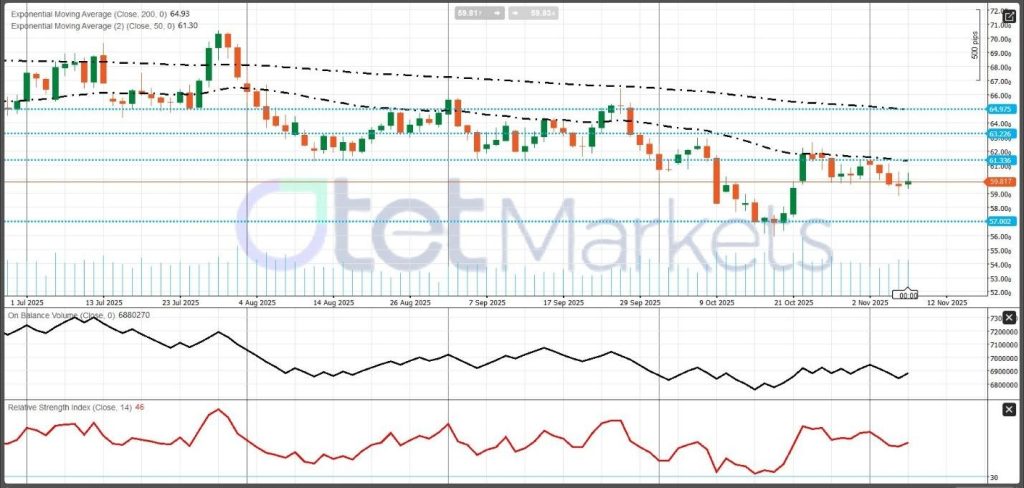 فنيًا، لا يزال خام غرب تكساس الوسيط عالقًا في “اتجاه هابط” (bearish trend)، يتداول أسفل كل من “المتوسط المتحرك الأسي لـ 50 يومًا” (حوالي 61.30 دولار) و “المتوسط المتحرك الأسي لـ 200 يوم” (حوالي 64.90 دولار)، والتي تستمر في الانحدار لأسفل. منذ أوائل أغسطس، شكل السوق “قممًا وقيعانًا أدنى” (lower highs and lower lows)، مما يشير إلى “ضغط بيع” مستمر. بعد ارتداد فاشل بالقرب من 62.50 دولار، تراجعت الأسعار مرة أخرى نحو 59-60 دولار، حيث تلاشى الزخم. تقع “المقاومة” (Resistance) عند 61.30 دولار، ثم 63.20-65.00 دولار، بينما “الدعم” الرئيسي (key support) عند حوالي 57.00 دولار – كسر ما دونه قد يؤدي إلى انخفاض آخر. بشكل عام، تظل النظرة هبوطية، مع ترجيح أن تواجه أي ارتفاعات مقاومة ما لم تستعد الأسعار المتوسط المتحرك الأسي لـ 50 يومًا بحجم تداول قوي.