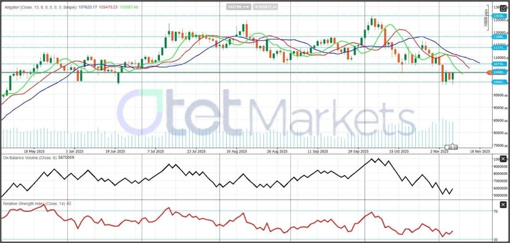 دخلت البيتكوين في اتجاه هابط واضح منذ منتصف أكتوبر، حيث انخفضت من منطقة 118 ألف – 126 ألف دولار لتتداول حول 100 ألف – 104 آلاف دولار. يؤكد “مؤشر التمساح” (Alligator indicator) “إعدادًا هبوطيًا” (bearish setup)، حيث يتداول السعر أسفل جميع المتوسطات المتحركة الرئيسية. بينما يظل الاتجاه الأوسع سلبيًا، تحاول البيتكوين “تشكيل قاعدة” (form a base) بالقرب من 100 ألف دولار، والتي صمدت مرارًا وتكرارًا “كدعم” قوي. طالما بقي السعر أقل من 107.2 ألف دولار، فمن المرجح أن تكون الارتدادات تصحيحية بدلاً من كونها بداية لاتجاه صاعد جديد. تقف مستويات المقاومة عند 104 آلاف دولار و 107.2 ألف دولار، مع أهداف صعودية إضافية بالقرب من 115 ألف – 118 ألف دولار و 126 ألف دولار، بينما كسر ما دون 100 ألف دولار قد يؤدي إلى خسائر أعمق.