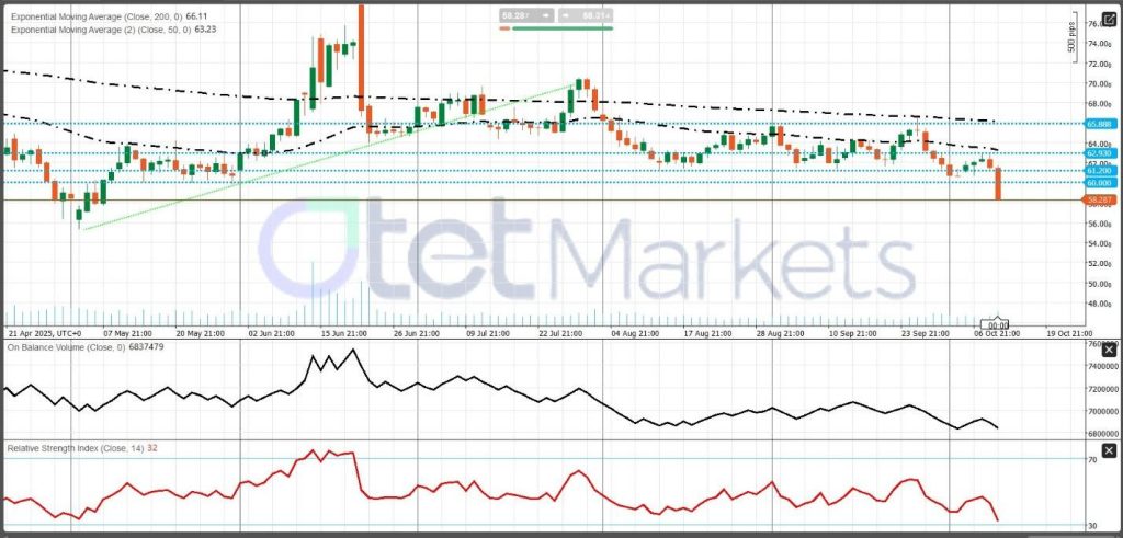 - الدعم الرئيسي: 60 دولارًا — الحفاظ على هذا المستوى يبقي على الميل الهبوطي.