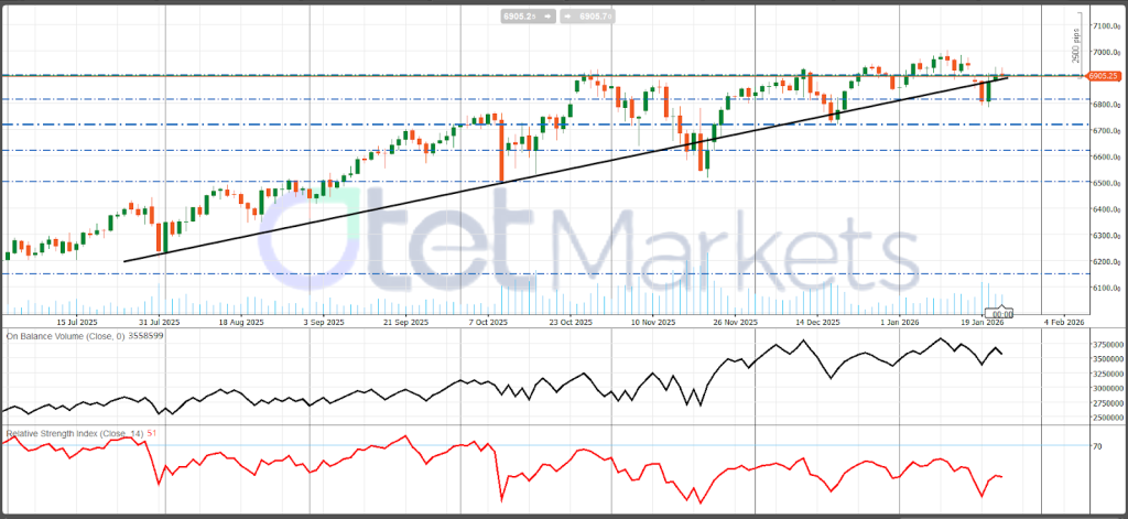 من الناحية الفنية: لا يزال مؤشر S&P 500 في اتجاه صاعد رئيسي يعود تاريخه إلى منتصف عام 2025، لكنه ينضغط الآن في منطقة فنية حاسمة حيث يتقارب دعم الاتجاه الصاعد مع المقاومة الأفقية بالقرب من 6،900. مؤشر القوة النسبية (RSI) حول 51 وهو مستوى محايد، مما يشير إلى وجود مساحة للتوسع بمجرد حل هذا الانضغاط. لا يزال مؤشر OBV بناءً على الاتجاه الأوسع ولكنه استقر (تسطح) مؤخراً، مما يشير إلى وجود مشترين لكنهم بحاجة إلى مشاركة جديدة لاختراق المقاومة بشكل حاسم. المستويات الرئيسية: المقاومة عند ~6،900–6،930، ثم 7،000–7،050؛ الدعم عند خط الاتجاه (~6،850–6،900)، ثم 6،800، يليه 6،700/6،600/6،500 إذا تسارع الهبوط.