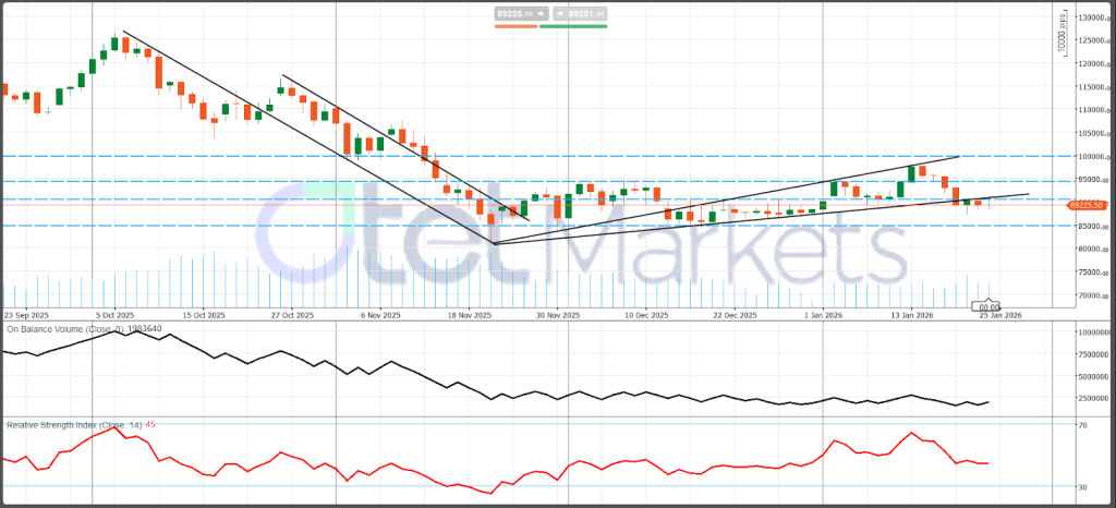 أنهى البيتكوين الأسبوع بالقرب من 89،500 دولار، حيث شهد انخفاضاً سجل خمس خسائر يومية متتالية. في وقت سابق من يناير، اختبرت BTC منطقة 98،000 دولار لكنها عكست اتجاهها للأسفل مع اشتداد المخاطر السياسية الأمريكية وتدهور شهية المخاطرة الأوسع. لم يكن المحرك المهيمن أساسيات خاصة بالعملات المشفرة، بل إعادة تسعير حادة لمصداقية السياسة والمخاطر المؤسسية في الولايات المتحدة.