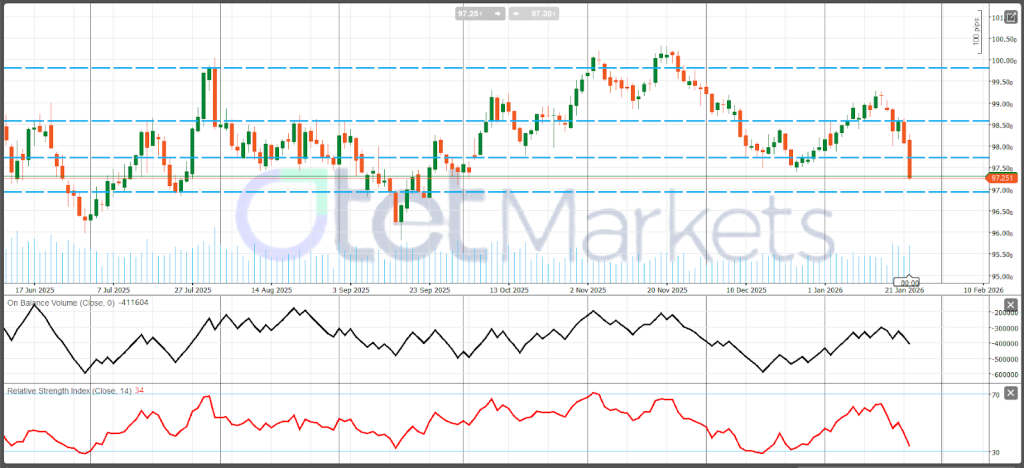 من الناحية الفنية: يمر مؤشر الدولار (DXY) بحركة تدوير هبوطية منذ ذروته في نوفمبر بالقرب من 100.0–100.5، حيث فشل مراراً وتكراراً عند منطقة العرض 98.6–99.2. التحرك الأخير هو اندفاع هبوطي حاد كسر الاتجاه الصاعد لشهر يناير ودفع السعر للعودة إلى (وأقل قليلاً من) المحور 97.5، مما يبقي التحيز السلبي قائماً على المدى القريب. مؤشر القوة النسبية (RSI) حول 34 هبوطي ويقترب من ذروة البيع، مما قد يسمح بارتدادات تكتيكية، رغم أنها ليست متطرفة بعد. مؤشر الحجم التراكمي (OBV) انقلب للأسفل مرة أخرى، مما يعزز الكسر الهبوطي. الدعم الرئيسي يقع عند 97.0–97.2 (الإغلاق أدناه يؤكد ذلك)، ثم 96.4–96.6 و96.0–96.2. المقاومة هي 97.5–97.8، ثم 98.0–98.2، 98.6، و99.2–100.5 في الأعلى.